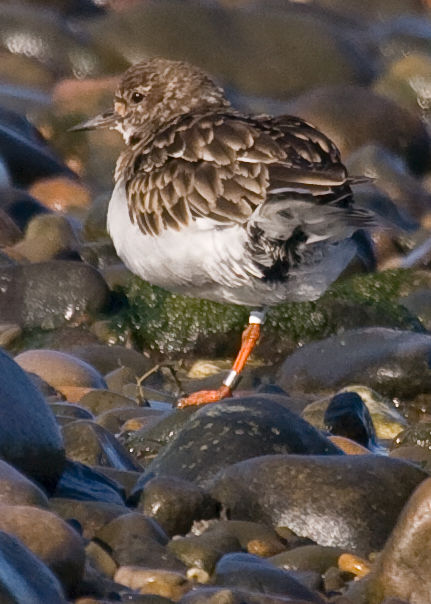 One of my local patches is Foulney Island. It is an island joined to the mainland by a causeway which is covered at high tide. This gives the waders some protection from casual disturbance by dog walkers etc. Below is a series of three pictures. The first one shows a Turnstone in summer plumage that has, just gone over, to use a flower arranging term. The second shows a bird still in winter plumage, plus ring. This was taken last week . The bird appeared tired possibly from a long migration flight. As I approached what appeared to be another ring was on the same leg but above the knee. I was unsure at what I may have seen. The B.T.O. have not ringed this species on the tarsus for many years . This made the bird almost certainly one with a foreign ring. I decided to move the bird gently along the beach. It hopped along on the other leg for 5 minutes. I did not want it to fly, just put it's other leg down. I thought the bird I was looking at was a one legged Turnstone and I had got it mixed up within the flock with the first bird. Eventually it swapped legs although I did not see it do this and then it flew into the centre of the flock. Only when I got home and viewed my shots did I see the flag on the tibia. This is a white flag and that denotes a Canadian ringed bird probably Ellesmere Island. I have sent off the details and am awaiting confirmation |